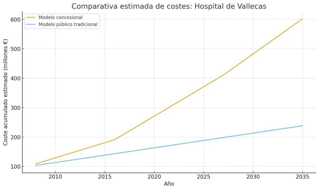 Conclusión razonable: con este modelo, el coste total —obra + amortización + servicio + mejoras + canon anual— puede ser varias veces mayor que el coste inicial de construcción. Es decir, a lo largo de la concesión, la Comunidad de Madrid podría terminar pagando un hospital “multivitaminado” cuyo coste acumulado triplique o cuadruplique el coste original.
